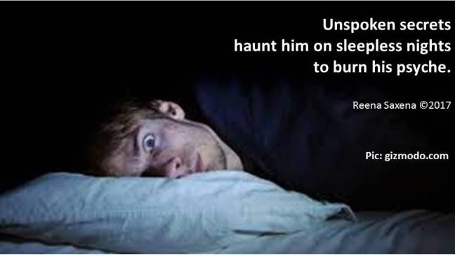 Sleepless Nights Posted on February 28, 2017 by Reena Saxena Unspoken secrets haunt him on sleepless nights to burn his psyche. Inspired by RonovanWrites #Weekly Haiku Poetry Prompt Challenge – 138 https://ronovanwrites.wordpress.com/2017/02/27/ronovanwrites-weekly-haiku-poetry-prompt-challenge-138-secretburn/ Coverpic: gizmodo.com Share this: Email a link to a friend (Opens in new window) Email Share on WhatsApp (Opens in new window) WhatsApp TweetLike Loading...