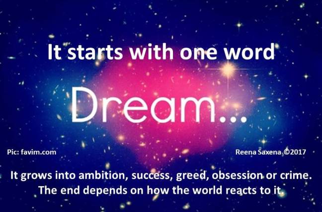 Dreams Posted on March 15, 2017March 15, 2017 by Reena Saxena It starts with one word β dreams. It grows into ambition, success, greed, obsession or crime. The end depends on how the world reacts to it. (140 characters) Inspired by Twittering Tales by Kat Myrman Twittering Tales #21 – 14 March 2017 Share this: Email a link to a friend (Opens in new window) Email Share on WhatsApp (Opens in new window) WhatsApp TweetLike Loading...