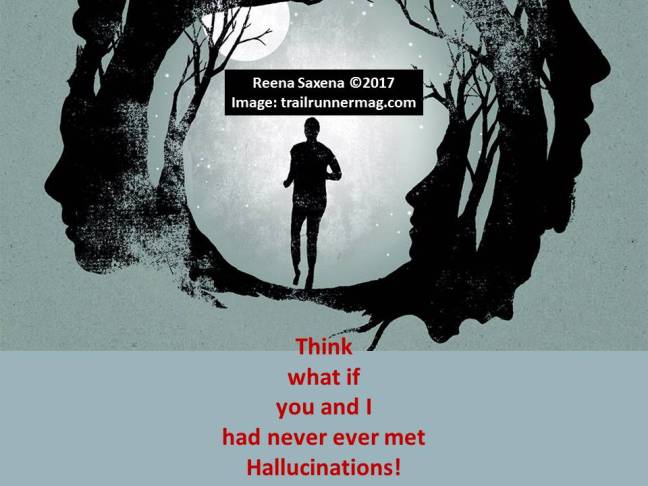 Hallucinations Posted on June 11, 2017 by Reena Saxena Think What if you and I has never ever met Hallucinations! Elfje (Poem meter 1,2,3,4,1) inspired by Saturday Mix Image: trailrunnermag.com Share this: Email a link to a friend (Opens in new window) Email Share on WhatsApp (Opens in new window) WhatsApp TweetLike Loading...