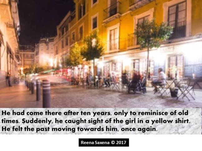 Old Times Posted on June 20, 2017 by Reena Saxena He had come there after ten years, only to reminisce of old times. Suddenly, he caught sight of the girl in a yellow shirt. He felt the past moving towards him, once again. Inspired by Kat Myrman at Twittering Tales #35 Image: Tyler Hendy at pexels.com Share this: Email a link to a friend (Opens in new window) Email Share on WhatsApp (Opens in new window) WhatsApp TweetLike Loading...