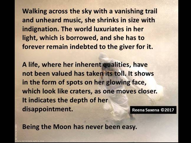 Walking across the sky with a vanishing trail and unheard music, she shrinks in size with indignation. The world luxuriates in her light, which is borrowed, and she has to forever remain indebted to the giver for it.