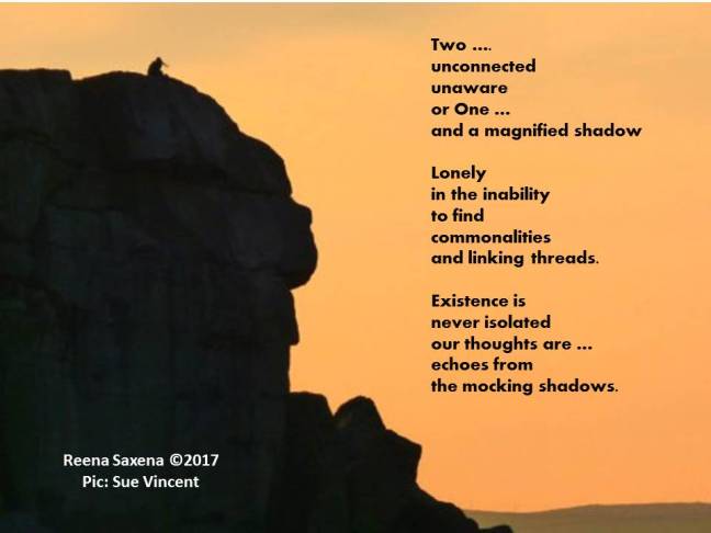 Mocking Shadows Posted on August 10, 2017 by Reena Saxena Two …. unconnected unaware or One … and a magnified shadow Lonely in the inability to find commonalities and linking threads. Existence is never isolated our thoughts are … echoes from the mocking shadows. Inspired by Sue Vincent at Thursday Photo Prompt #writephoto Share this: Email a link to a friend (Opens in new window) Email Share on WhatsApp (Opens in new window) WhatsApp TweetLike Loading...