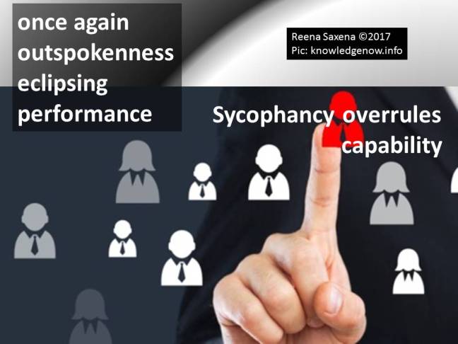 Once again Posted on August 22, 2017August 22, 2017 by Reena Saxena Once again outspokenness eclipsing performance sycophancy overrules capability Shadorma – Inspiration available at Daily Word Prompt #188 Image: knowledgenow.com Share this: Email a link to a friend (Opens in new window) Email Share on WhatsApp (Opens in new window) WhatsApp TweetLike Loading...