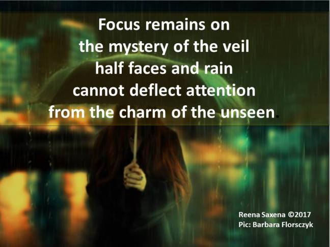 Focus Posted on August 29, 2017 by Reena Saxena Focus remains on the mystery of the veil half faces and rain cannot deflect attention from the charm of the unseen. Photo Challenge #178 at MLMM Share this: Email a link to a friend (Opens in new window) Email Share on WhatsApp (Opens in new window) WhatsApp TweetLike Loading...