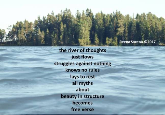 Expressions Posted on September 18, 2017 by Reena Saxena the river of thoughts just flows struggles against nothing knows no rules lays to rest all myths about beauty in structure becomes free verse Weekly Writing Prompt #107 Share this: Email a link to a friend (Opens in new window) Email Share on WhatsApp (Opens in new window) WhatsApp TweetLike Loading...