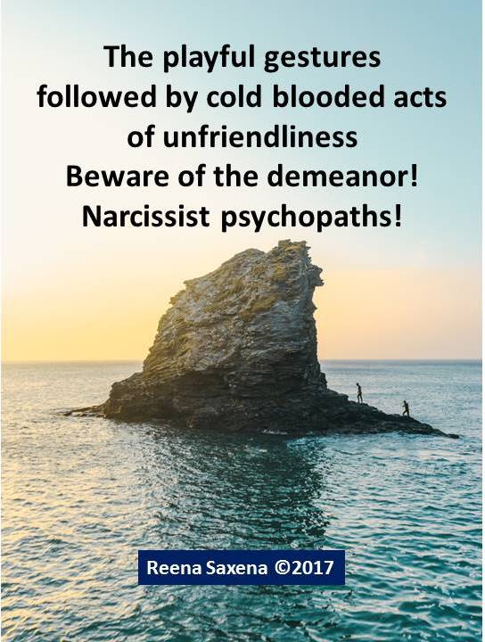 Run for life Posted on September 20, 2017 by Reena Saxena The playful gestures followed by cold blooded acts of unfriendliness Beware of the demeanor! Narcissist psychopaths! Weekly Tanka Prompt Challenge #Week 63 by Elsie Hagley Share this: Email a link to a friend (Opens in new window) Email Share on WhatsApp (Opens in new window) WhatsApp TweetLike Loading...