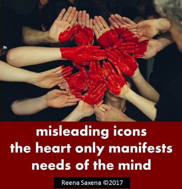 Misleading Icons Posted on October 9, 2017 by Reena Saxena misleading icons the heart only manifests needs of the mind Ronovan Writes Weekly Haiku Challenge Share this: Email a link to a friend (Opens in new window) Email Share on WhatsApp (Opens in new window) WhatsApp TweetLike Loading...