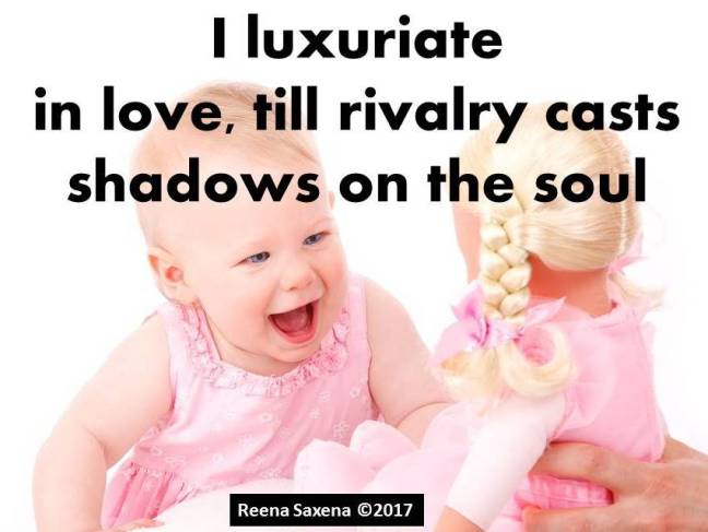 Rivalry Posted on October 14, 2017 by Reena Saxena I luxuriate in love, till rivalry casts shadows on the soul Weekend Writing Propmt #24 by Sammi Cox Share this: Email a link to a friend (Opens in new window) Email Share on WhatsApp (Opens in new window) WhatsApp TweetLike Loading...