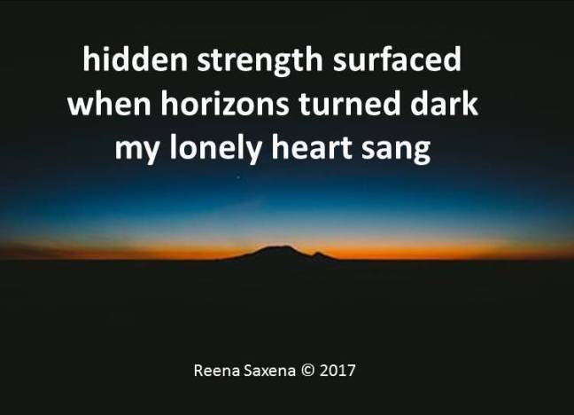 Discovering Strength Posted on November 27, 2017 by Reena Saxena hidden strength surfaced when horizons turned dark my lonely heart sang Ronovan Writes Weekly Haiku Poetry Prompt Challenge #177 Share this: Email a link to a friend (Opens in new window) Email Share on WhatsApp (Opens in new window) WhatsApp TweetLike Loading...