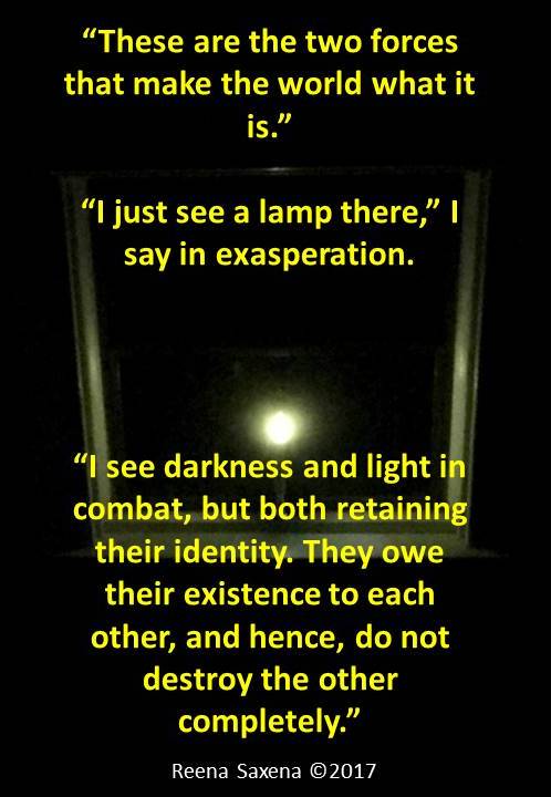 “I see darkness and light in combat, but both retaining their identity. They owe their existence to each other, and hence, do not destroy the other completely.”