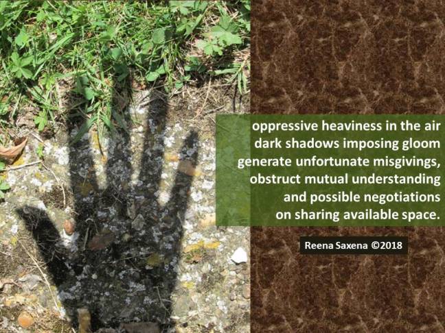 Misgivings Posted on January 13, 2018 by Reena Saxena oppressive heaviness in the air dark shadows imposing gloom generate unfortunate misgivings, obstruct mutual understanding and possible negotiations on sharing available space. Weekend Writing Prompt #37 Share this: Email a link to a friend (Opens in new window) Email Share on WhatsApp (Opens in new window) WhatsApp TweetLike Loading...