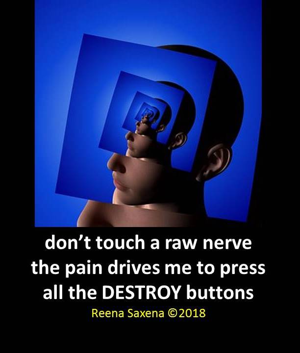 Destroy Posted on January 17, 2018 by Reena Saxena don’t touch a raw nerve the pain drives me to press all the DESTROY buttons Ronovan Writes Share this: Email a link to a friend (Opens in new window) Email Share on WhatsApp (Opens in new window) WhatsApp TweetLike Loading...
