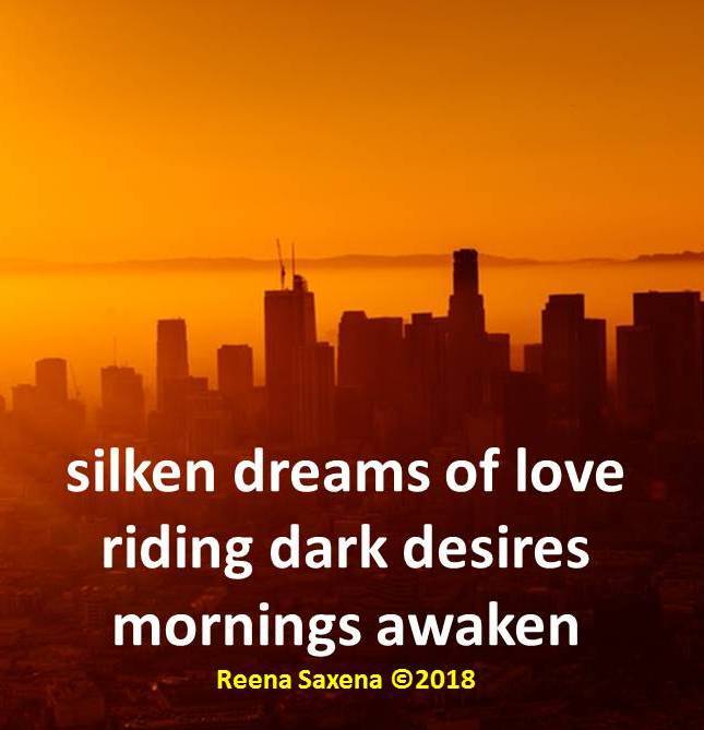 Silken Dreams Posted on February 7, 2018February 7, 2018 by Reena Saxena silken dreams of love riding dark desires mornings awaken Heeding Haiku with Chevrefeuille Share this: Email a link to a friend (Opens in new window) Email Share on WhatsApp (Opens in new window) WhatsApp TweetLike Loading...