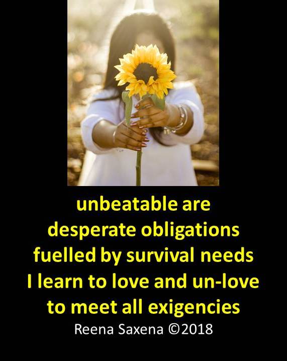 Desperate Obligations Posted on February 13, 2018 by Reena Saxena unbeatable are desperate obligations fuelled by survival needs I learn to love and un-love to meet all exigencies February Writing Prompts Share this: Email a link to a friend (Opens in new window) Email Share on WhatsApp (Opens in new window) WhatsApp TweetLike Loading...