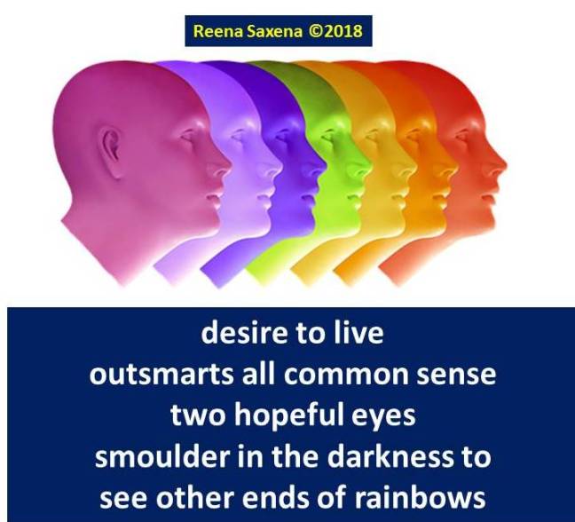 Desire to Live Posted on February 14, 2018 by Reena Saxena desire to live outsmarts all common sense two hopeful eyes smoulder in the darkness to see other ends of rainbows In other words, desire at Patricia’s Place Share this: Email a link to a friend (Opens in new window) Email Share on WhatsApp (Opens in new window) WhatsApp TweetLike Loading...