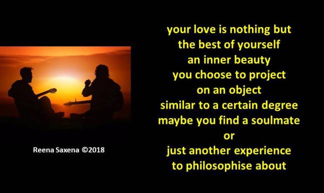 Just another Posted on April 23, 2018 by Reena Saxena your love is nothing but the best of yourself an inner beauty you choose to project on an object similar to a certain degree maybe you find a soulmate or just another experience to philosophise about Share this: Email a link to a friend (Opens in new window) Email Share on WhatsApp (Opens in new window) WhatsApp TweetLike Loading...