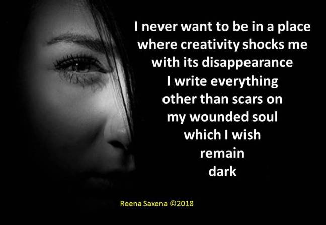 Remain dark Posted on April 30, 2018 by Reena Saxena I never want to be in a place where creativity shocks me with its disappearance I write about all other than scars on my wounded soul which I wish remain dark Weekly Writing Challenge #139 Share this: Email a link to a friend (Opens in new window) Email Share on WhatsApp (Opens in new window) WhatsApp TweetLike Loading...