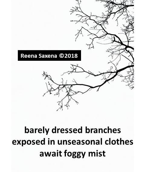 Foggy odor Posted on August 21, 2018 by Reena Saxena barely dressed branches exposed in unseasonal clothes await foggy mist Heeding Haiku with Chevrefeuille Share this: Email a link to a friend (Opens in new window) Email Share on WhatsApp (Opens in new window) WhatsApp TweetLike Loading...