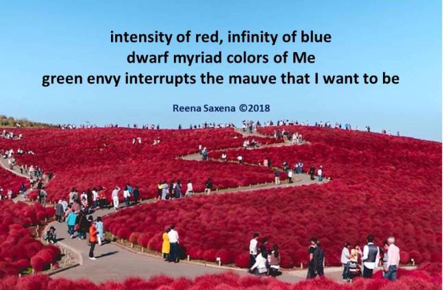 Medley Posted on November 1, 2018 by Reena Saxena intensity of red, infinity of blue dwarf myriad colors of Me green envy interrupts the purple that I want to be Three Line Tales Share this: Email a link to a friend (Opens in new window) Email Share on WhatsApp (Opens in new window) WhatsApp TweetLike Loading...