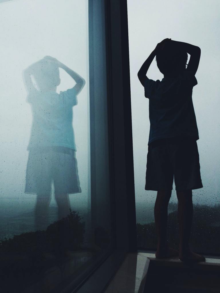 (The image shows a child looking at his image in a clear glass.)