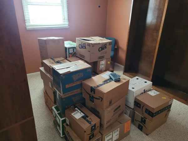 Meanwhile, a toy winks at me from a box. I notice somebody’s life packed in a few boxes, waiting to find a new home.