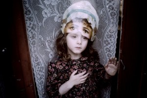 The image shows a child with a head superimposed on it. The girl’s expression is pensive, while the superimposed head has observant eyes.