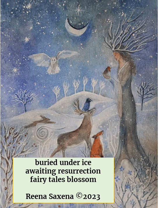 buried under ice awaiting resurrection fairy tales blossom Picture credit: Welcome December, ‘December’s Song’ Watercolour by Elaine Bayley Illustrations Tanka Tuesday - 24 Seasons Syllabic Poetry Challenge